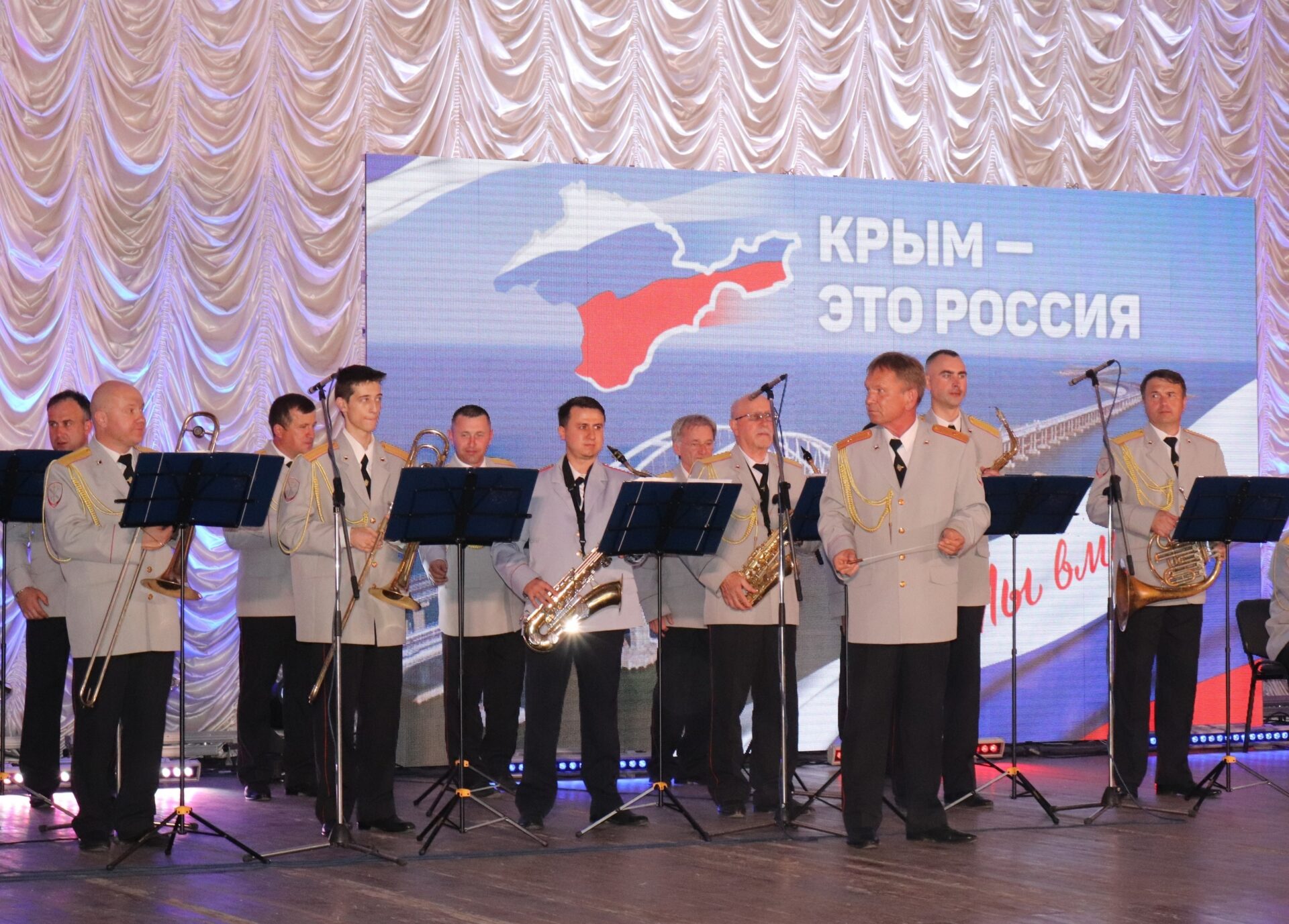 В программу концерта вошли патриотические номера в исполнении оркестра Министерства внутренних дел по Республике Крым, образцовых ансамблей и заслуженных коллективов народного творчества.