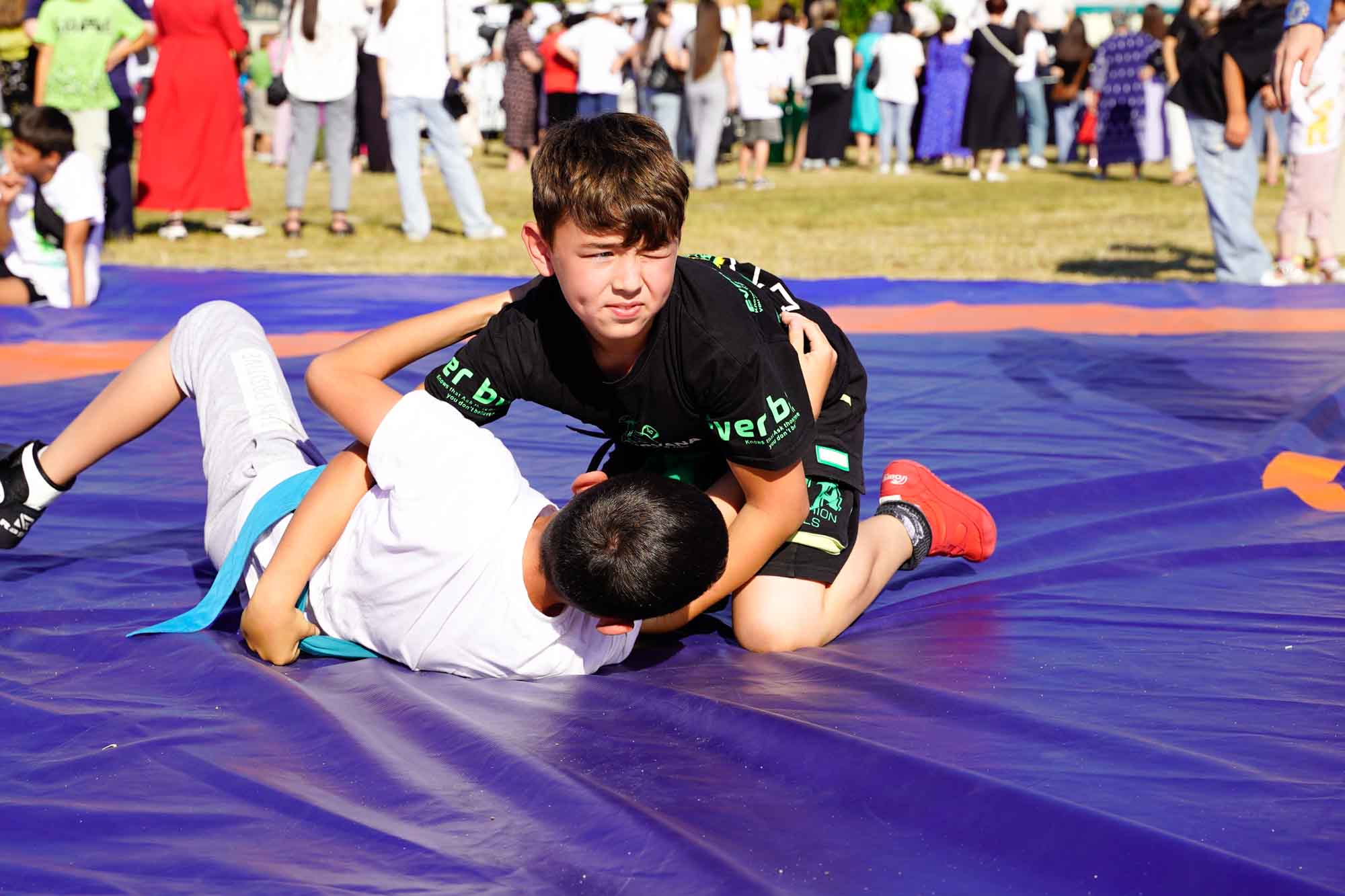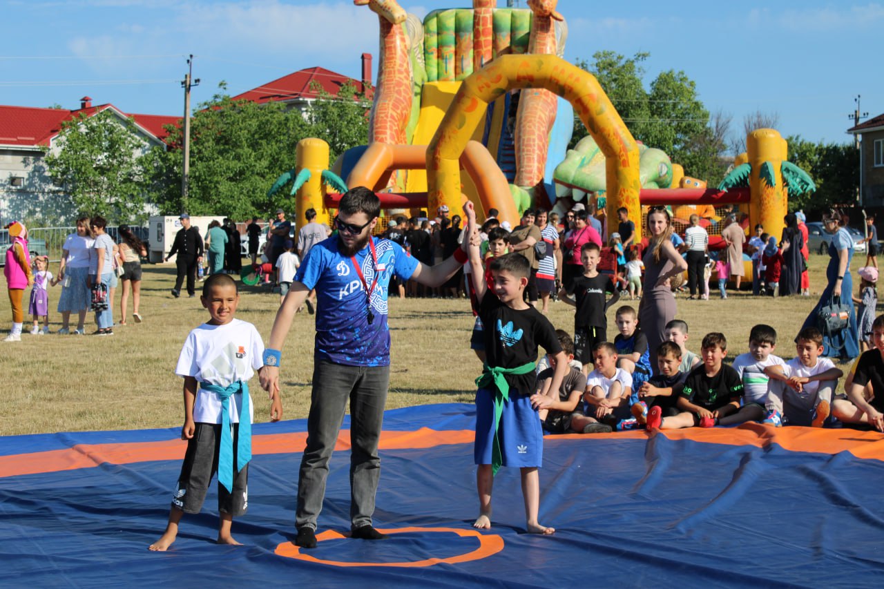 На спортивной площадке развернулись состязания по борьбе Куреш, в которых приняли участие десятки спортсменов. Самый сильный борец по традиции получил главный приз — живого барашка.