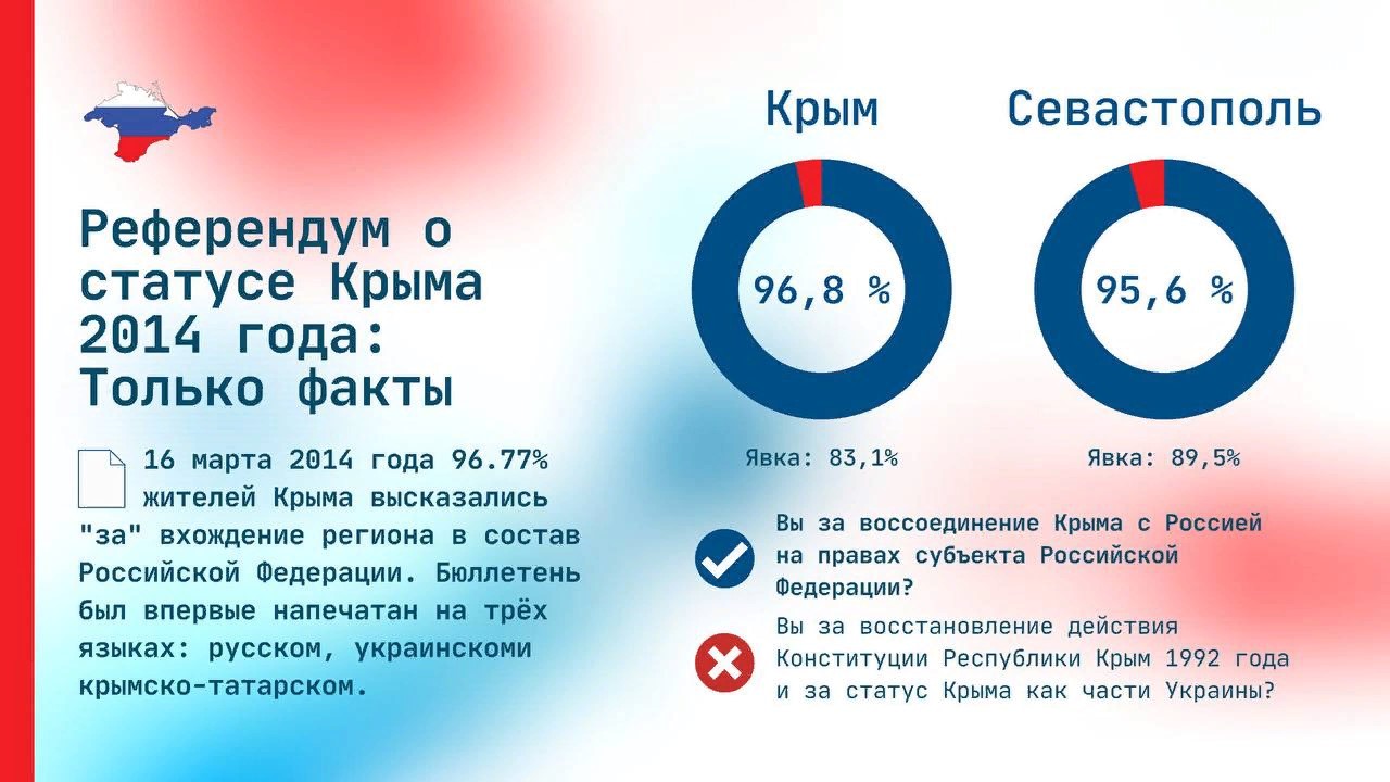 Референдум 2014 года был назначен на 25 мая, но уже 1 марта только что избранный новый премьер-министр полуострова и лидер движения «Русское единство» Сергей Аксёнов обратился к президенту РФ Владимиру Путину с просьбой оказать содействие в сохранении мира в регионе. Дата референдума была сдвинута на 30 марта, а затем на 16 марта. Крымчане отвечали на два вопроса — по воссоединению Крыма с Россией и по восстановлению действия Конституции Республики Крым 1992 года. За вхождение в состав России проголосовали 96,77% жителей Крыма и 95,6% — Севастополя.