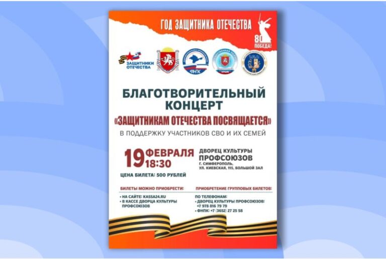 19 февраля в 18:30 во Дворце культуры профсоюзов в Симферополе (ул. Киевская, 115) состоится благотворительный концерт «Защитникам Отечества посвящается», призванный оказать поддержку участникам специальной военной операции и членам их семей. Все собранные средства будут направлены на приобретение необходимых предметов для…