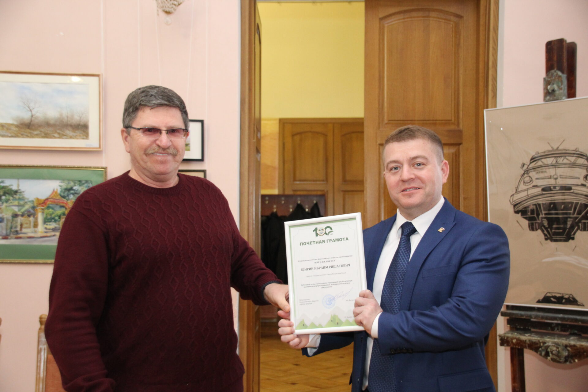 Председатель Комиссии по вопросам развития инфраструктуры, ЖКХ и экологии ОП РК Лев Григорьев вручил почётные грамоты от председателя Всероссийского общества охраны природы Вячеслава Фетисова депутату Государственного Совета Республики Крым Ибраиму Ширину, а также общественным деятелям Елене Деркач и Максиму Березовскому.