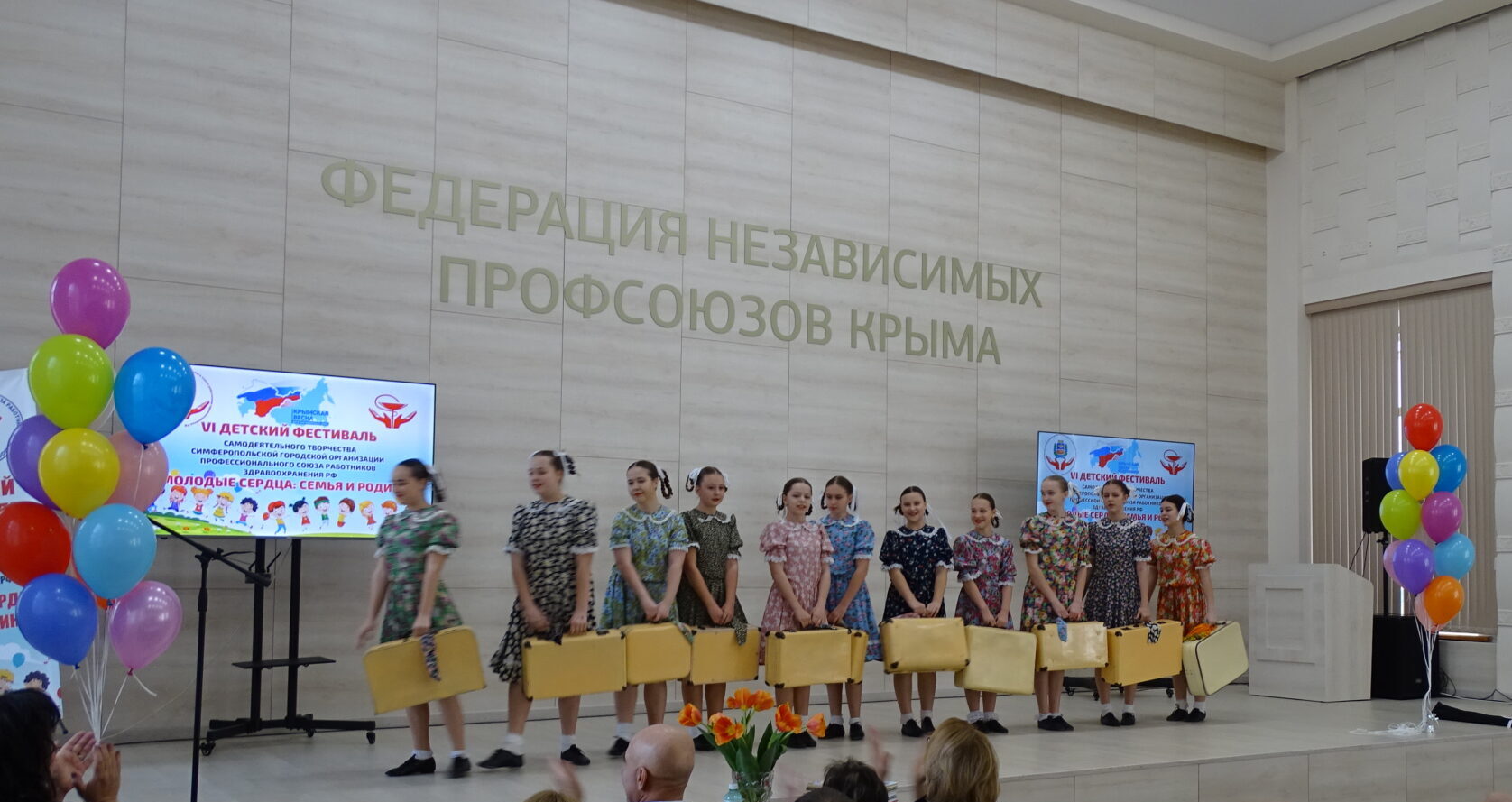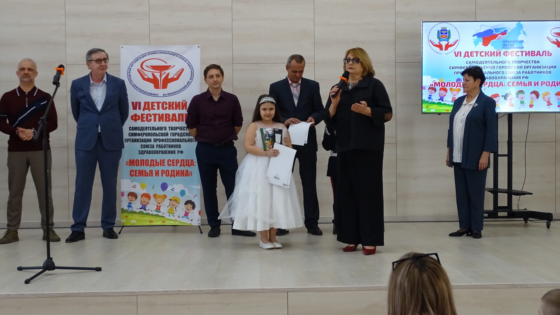 В Симферополе на сцене Большого зала Федерации независимых профсоюзов Крыма состоялся VI детский фестиваль самодеятельного творчества «Молодые сердца: Семья и Родина», приуроченный ко Дню Крымской весны. Фестиваль провела Симферопольская городская организация профсоюзов работников здравоохранения РФ с целью развития творческого потенциала детей сотрудников, членов Профсоюза лечебных учреждений города Симферополя, воспитания у них чувства патриотизма, любви к Родине, уважения к духовно-нравственным семейным ценностям и традициям.В мероприятии традиционно приняли участие дети членов профсоюза, работающих в лечебных  учреждениях города. Среди них —  ГБУЗ РК «Симферопольская городская детская клиническая больница», ГБУЗ РК «Симферопольская поликлиника №2» и «Симферопольская поликлиника №3», ГБУЗ РК «Симферопольский клинический родильный дом №1», ГБУЗ РК «Симферопольская клиническая больница скорой медицинской помощи №6», ГАУЗ «Симферопольский стоматологический центр».
